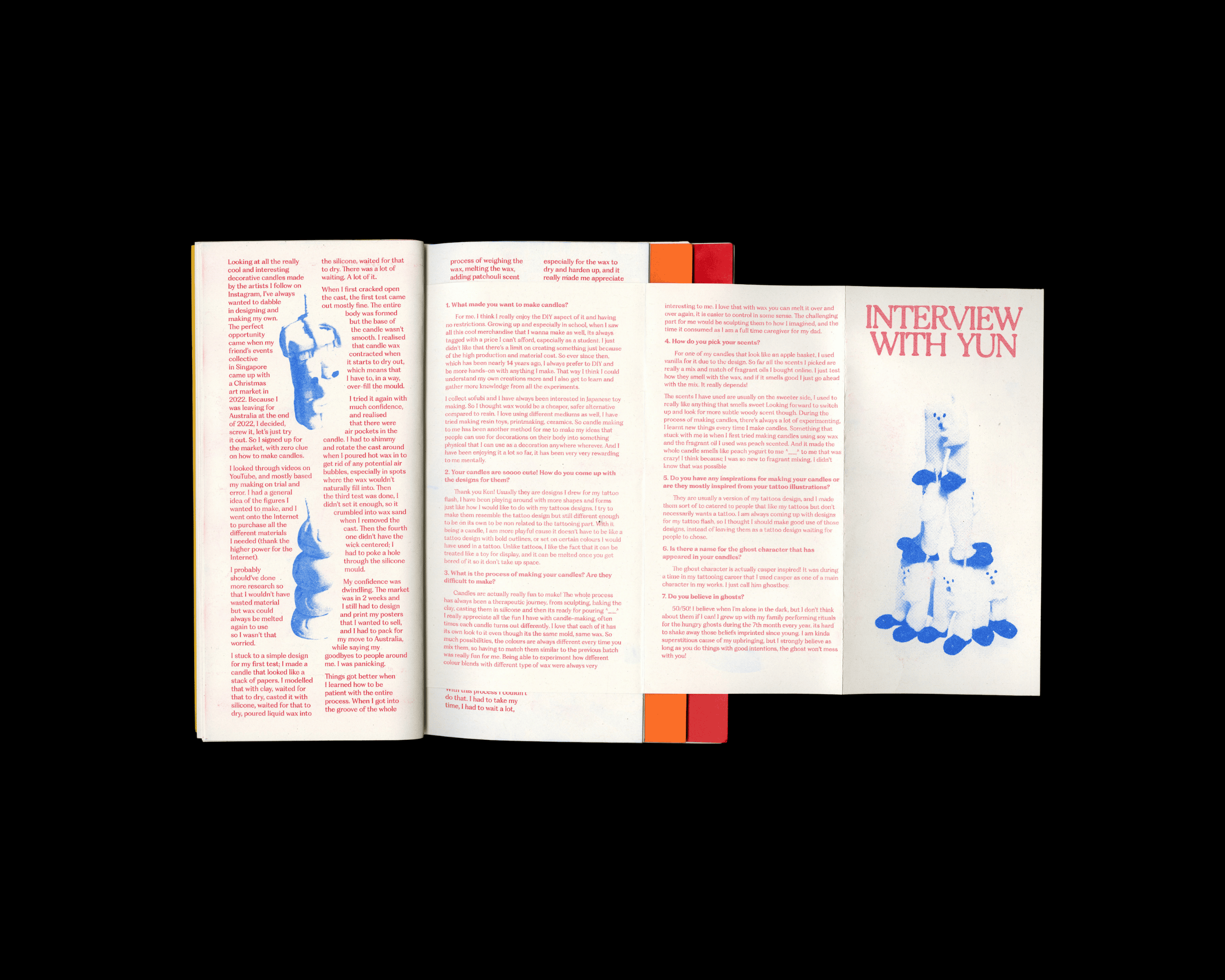 This publication is printed via risograph with two colours (bright red and blue) on Colorplan and Ecostar stock, bound with a paper fastener.